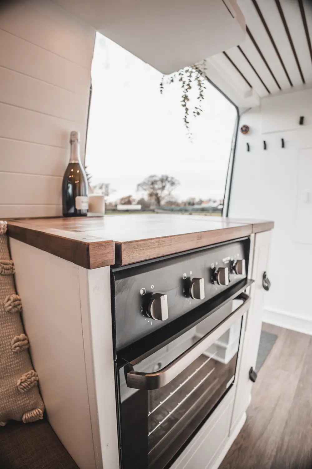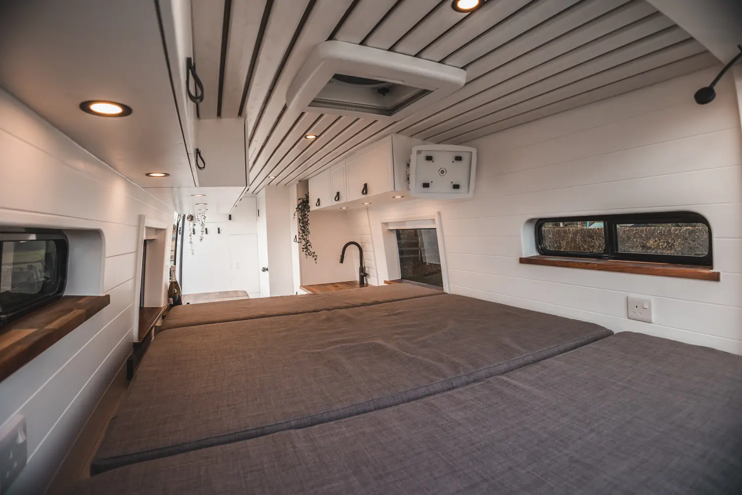 - Kitchen units on both sides of the van with routered shaker style fronts and black American Walnut worktops