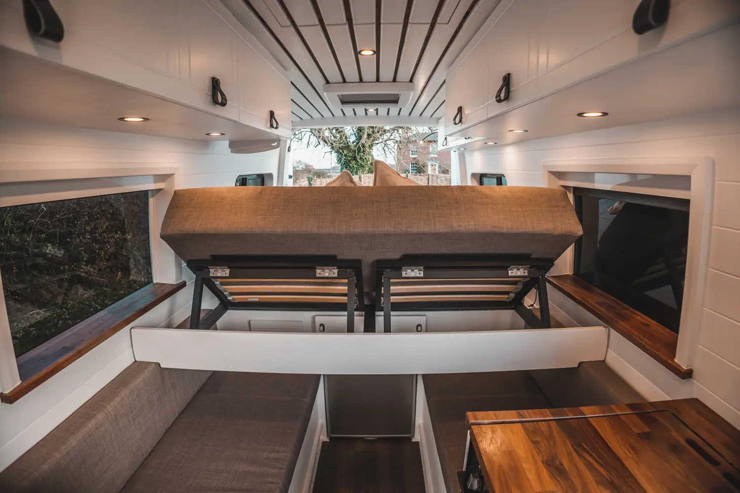 - A king sized bed with a large fixed portion and an extending slide out section. Each end can flip up to create a back rest facing the view out of the back doors or facing into the van