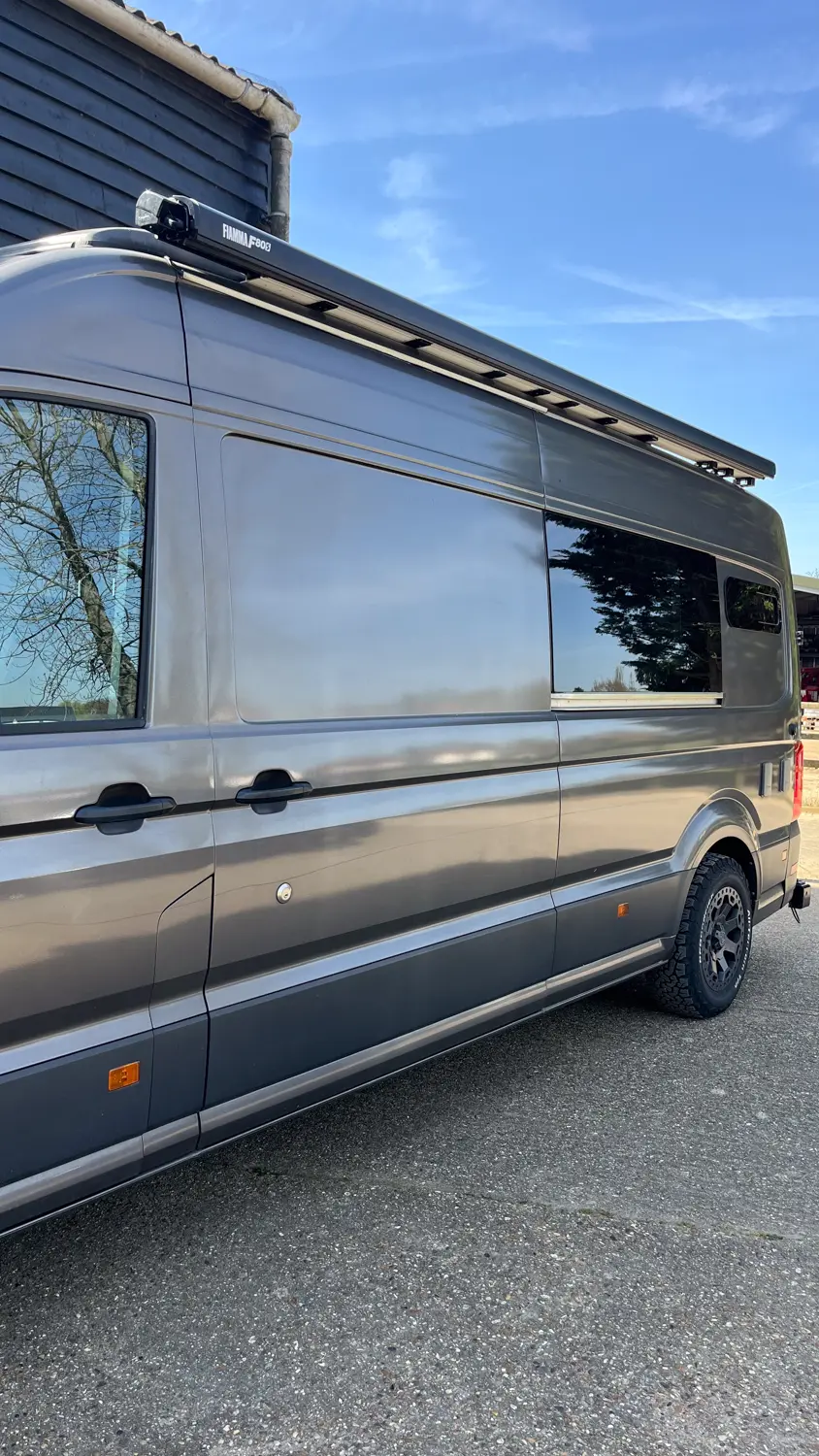 This gun metal grey LWB VW Crafter is a 2020 plate with only 23,000 miles (at the time of listing). The van was initially converted from new by Vanlife Conversions.